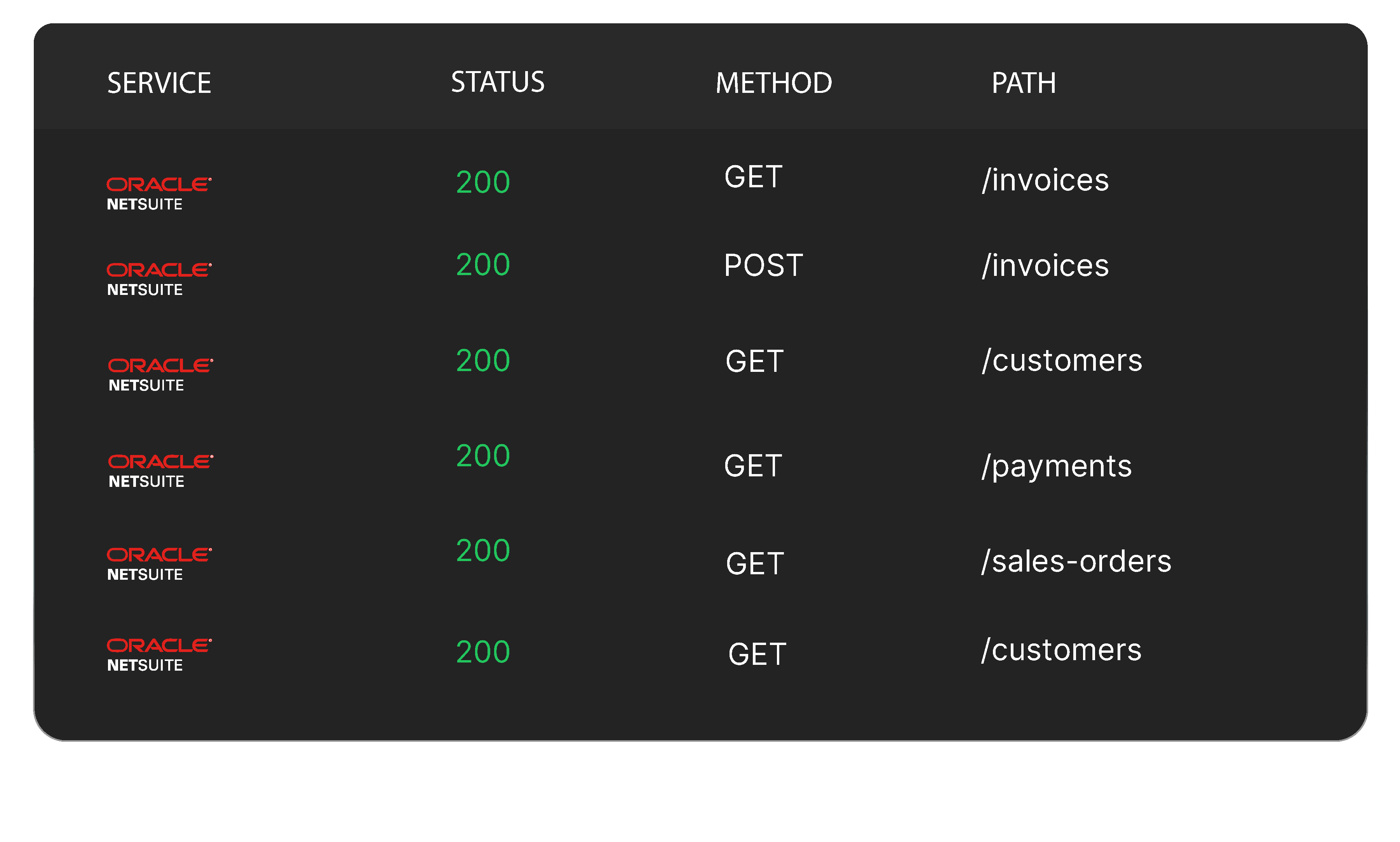 Here are the endpoints you can access using our Unified API for Oracle NetSuite. Monitor, manage, and integrate in just a few clicks.